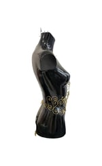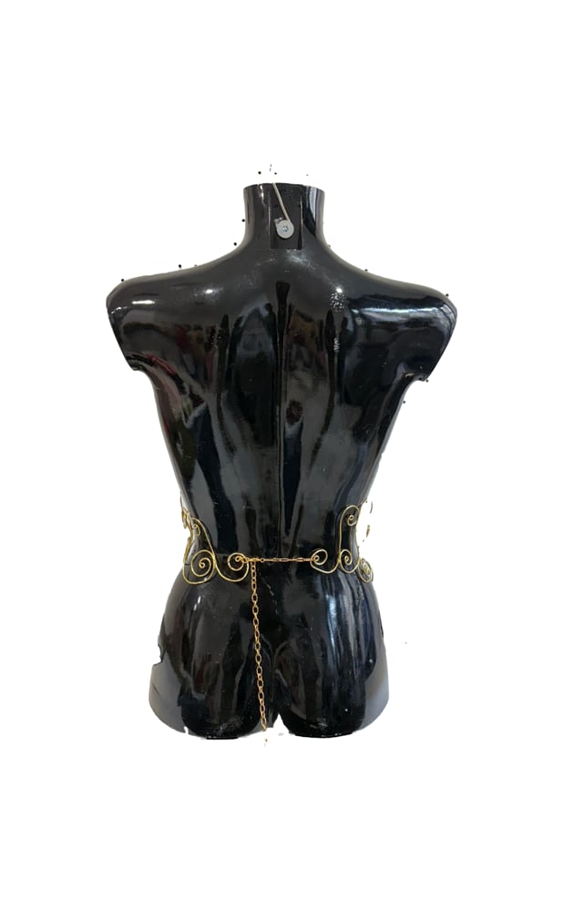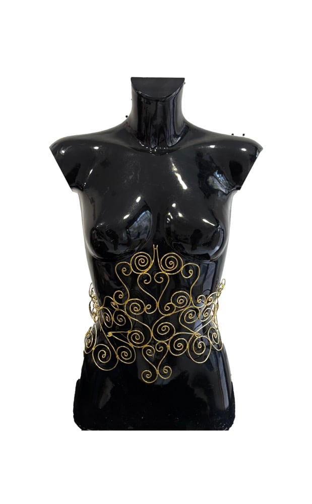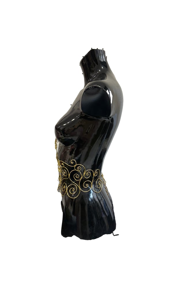 Corsalia est un corset unique, entièrement fait main et directement inspiré des motifs et structures des portails traditionnels africains. Réalisé en cuivre inoxydable, il allie solidité, symbolique et esthétique. Sa conception minutieuse a nécessité 5 heures et 25 minutes de travail artisanal, garantissant une pièce authentique et durable.