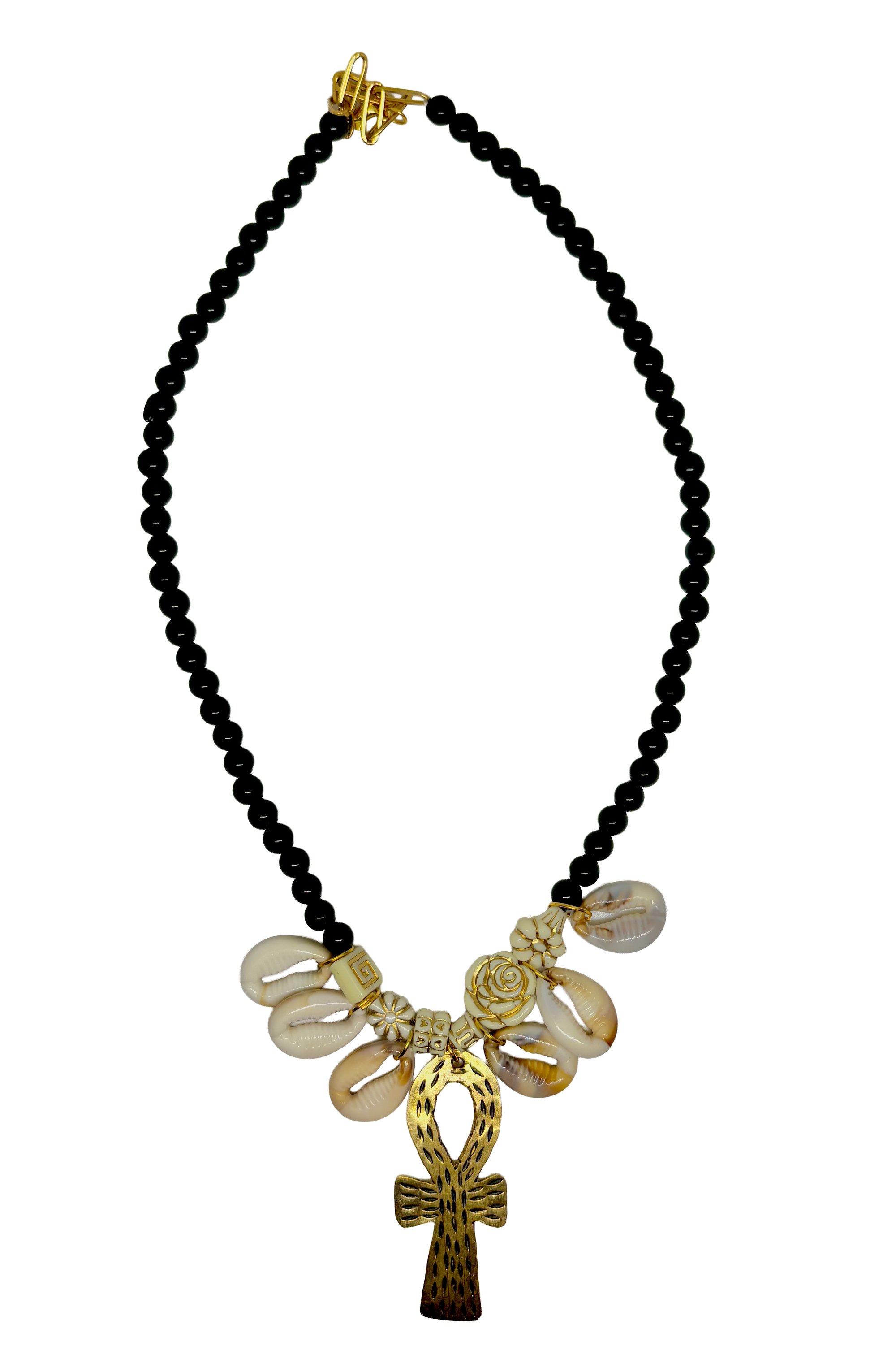 Collier fait mains avec perles noires,perles en koris et pendentif Ankh.