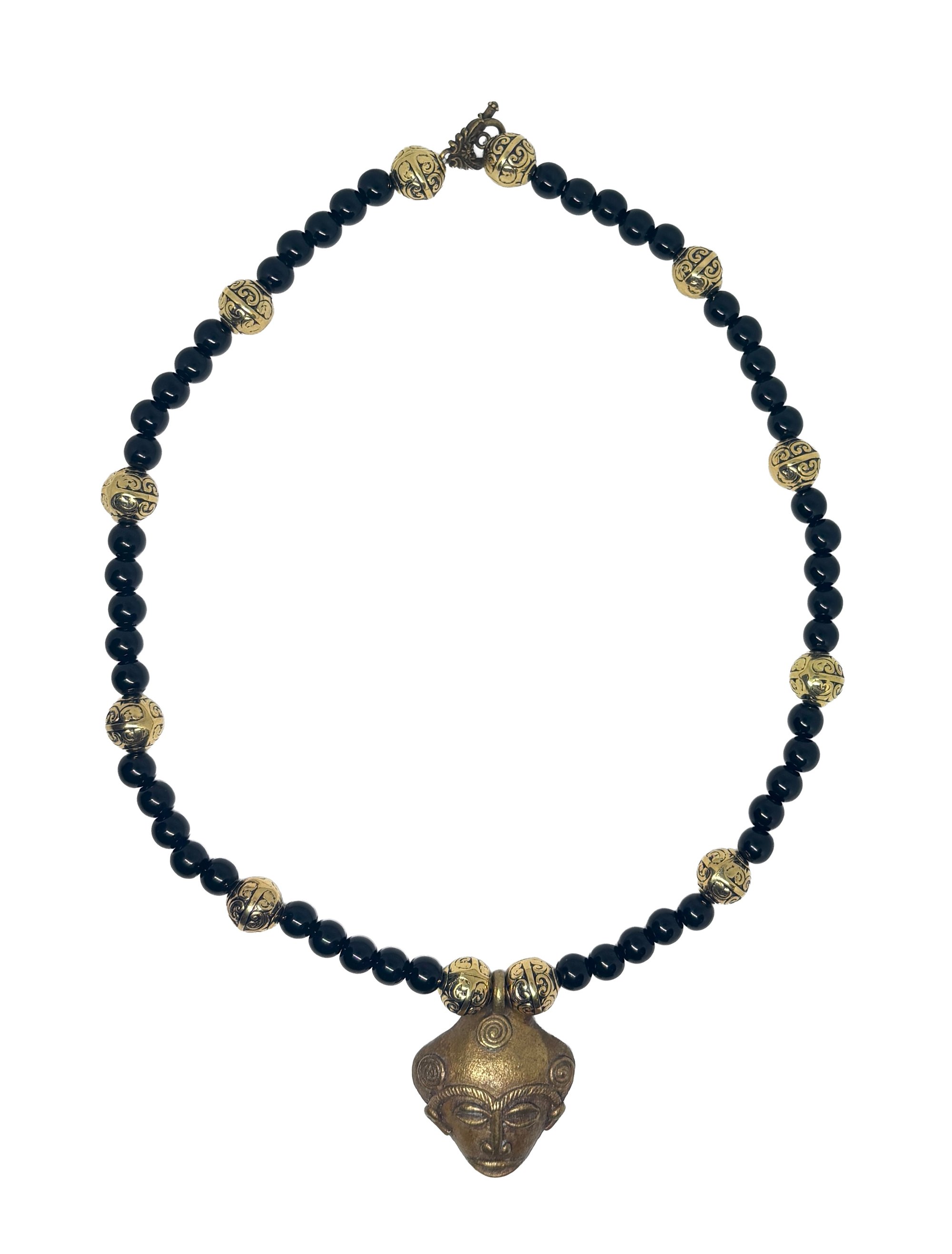 Suki Ngao — un nom métissé qui réunit deux mondes : Suki signifie «cheveux» en lingala, et Ngao veut dire «bouclier» en swahili. Ce collier, inspiré de la culture ivoirienne, porte en pendentif un masque en bronze, symbole de protection,transmission et de prestige africain. Les perles noires rappellent la beauté des tresses Afro, tandis que les perles dorées évoquent les accessoires traditionnels qui les subliment.